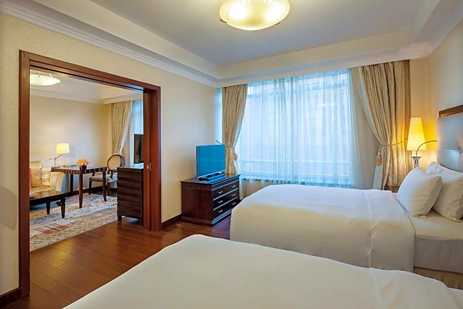 Deluxe King or Twin Rooms offer a lavish 56 square yards across a separate living room and bedroom, with ample space for work, rest and entertaining. A marble-furnished bathroom has twin vanities, a bath tub, bidet and separate rain shower stall.